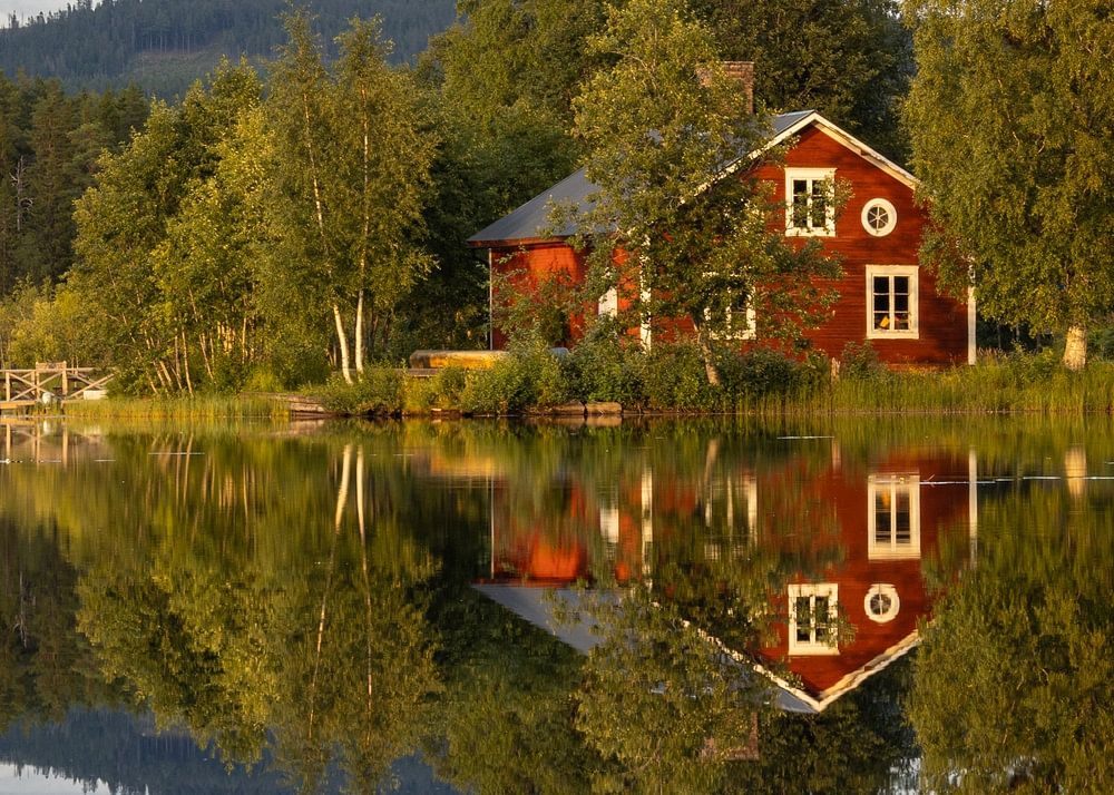 La lumière du soleil illumine les arbres verts et la maison rouge, tandis que des nuages intéressants couvrent le ciel. Le tout se reflète dans les eaux calmes de l'un des nombreux lacs de Suède.