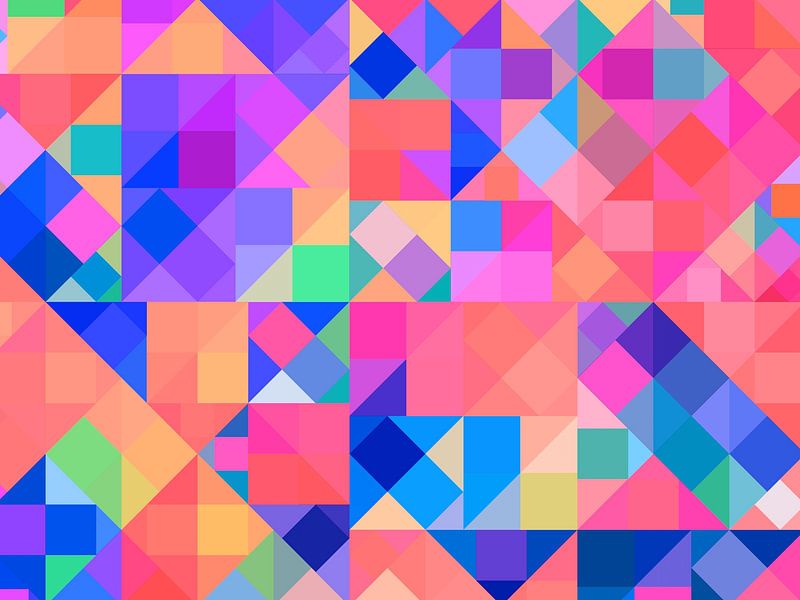 Jeu graphique avec des carreaux qui, par superposition, s'assemblent pour former des motifs et des formes décoratifs... Minimaliste et coloré dans le style Bauhaus.