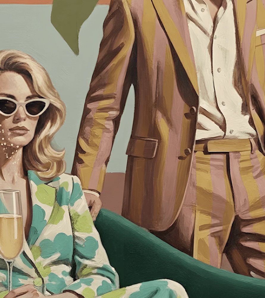 Derrière elle se tient un homme vêtu d'un costume remarquable, dont les rayures se déclinent dans des tons chauds de rose, d'ambre et de violet tendre. Il a une main dans la poche et un regard calme derrière des lunettes de soleil foncées. Sa chemise ouverte et sa posture décontractée suggèrent une atmosphère de liberté totale et de confort, comme si c'était leur lieu habituel pour laisser la journée s'écouler lentement.