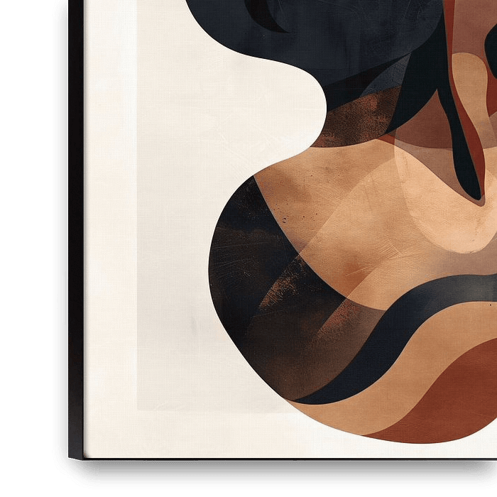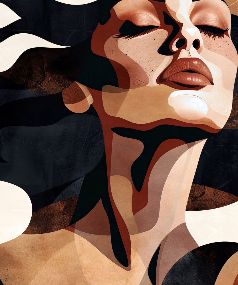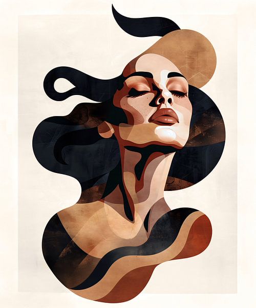 Portrait stylisé d'une femme aux yeux fermés et aux cheveux ondulés, dans des tons chauds et terreux fortement contrastés. La composition abstraite met l'accent sur l'émotion expressive et sereine capturée dans le portrait.