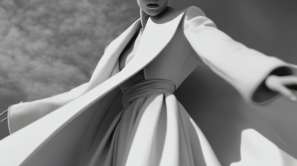 La photographie elle-même met l'accent sur le mouvement et l'élégance, avec de longues lignes et des poses gracieuses évoquant un sens du drame et du théâtre. Plein de glamour vintage, ce style rappelle l'âge d'or de la mode parisienne et apporte une touche de nostalgie pour une époque où la mode était une forme d'art, présentée avec une grandeur discrète mais puissante.
