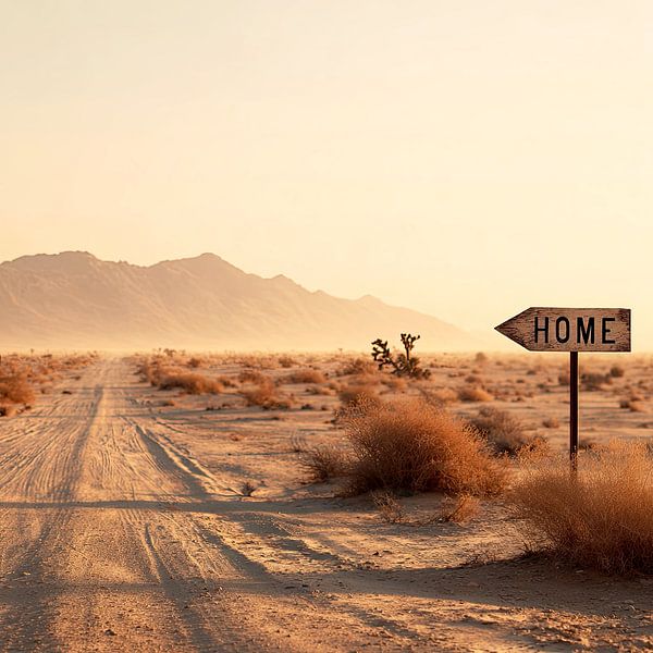 Cette reproduction artistique montre une route déserte dans un paysage aride, avec des montagnes au loin et un simple panneau portant un seul mot : « home ». L'image laisse beaucoup de place à l'interprétation et permet d'y associer sa propre signification. Accrochée au mur, cette œuvre fait office de point d'ancrage. Elle invite à la contemplation et soulève des questions sans imposer de réponses. Elle convient aux personnes qui aiment voyager, le silence et les images qui ne tout ne dévoilent pas. Dans un salon, un bureau ou un hall d'entrée, cette impression fait sensation sans en faire trop. C'est une œuvre qui n'explique pas où vous devez être, mais qui vous rappelle que choisir une direction peut suffire.