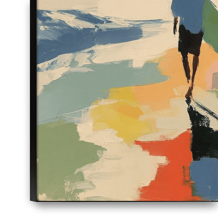 Un surfeur marche sur une plage chaude avec sa planche de surf, le soleil brille en grand et en jaune dans le ciel. Inspirée du style d'Henri Matisse, cette œuvre allie des couleurs vives, des formes douces et des coups de pinceau dynamiques. La mer scintille tranquillement, tandis que le surfeur est représenté dans des tons lumineux.…
