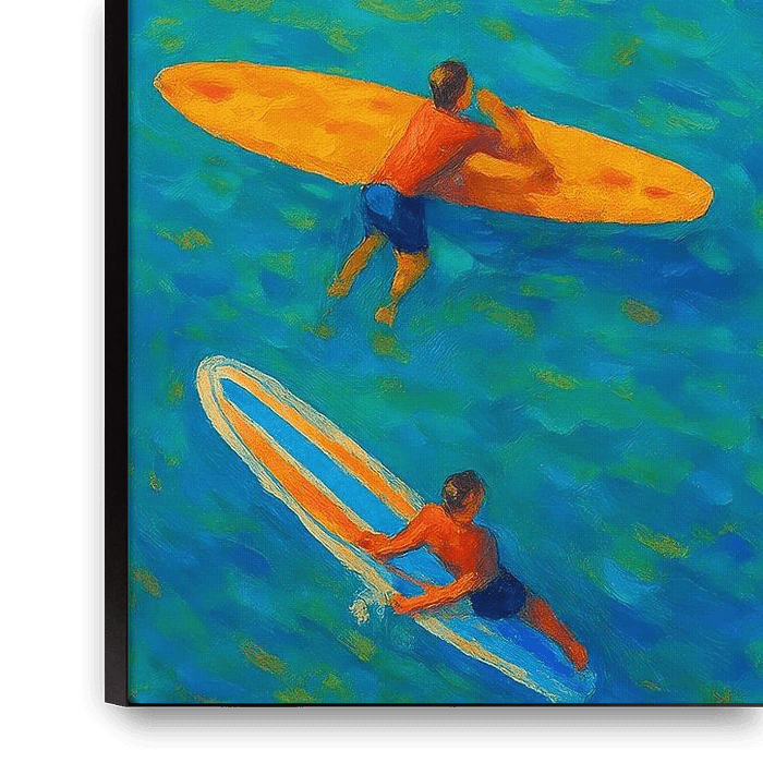 Achetez cette œuvre d'art abstraite Surfeurs colorés en mer par But First Framing sur toile, aluminium, ArtFrame ou photographie (encadrée), impression d'art en haute qualité et tout format.