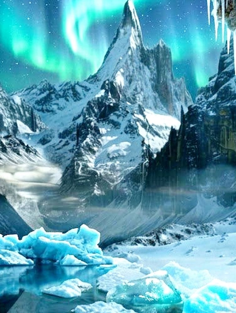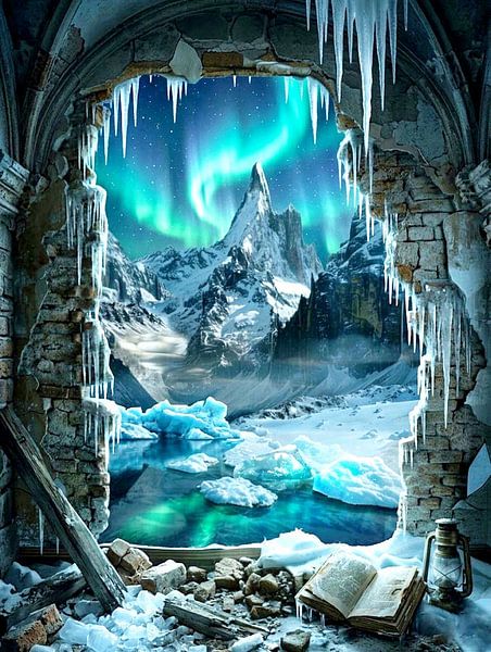 Cette composition numérique transporte le spectateur dans un monde où les frontières entre réalité et imagination s'estompent. À travers les décombres d'un mur de pierre en ruine, on aperçoit un spectacle naturel cosmique. De longs glaçons pointus pendent du mur fissuré comme des larmes figées, encadrant la scène. Au cœur de cette…