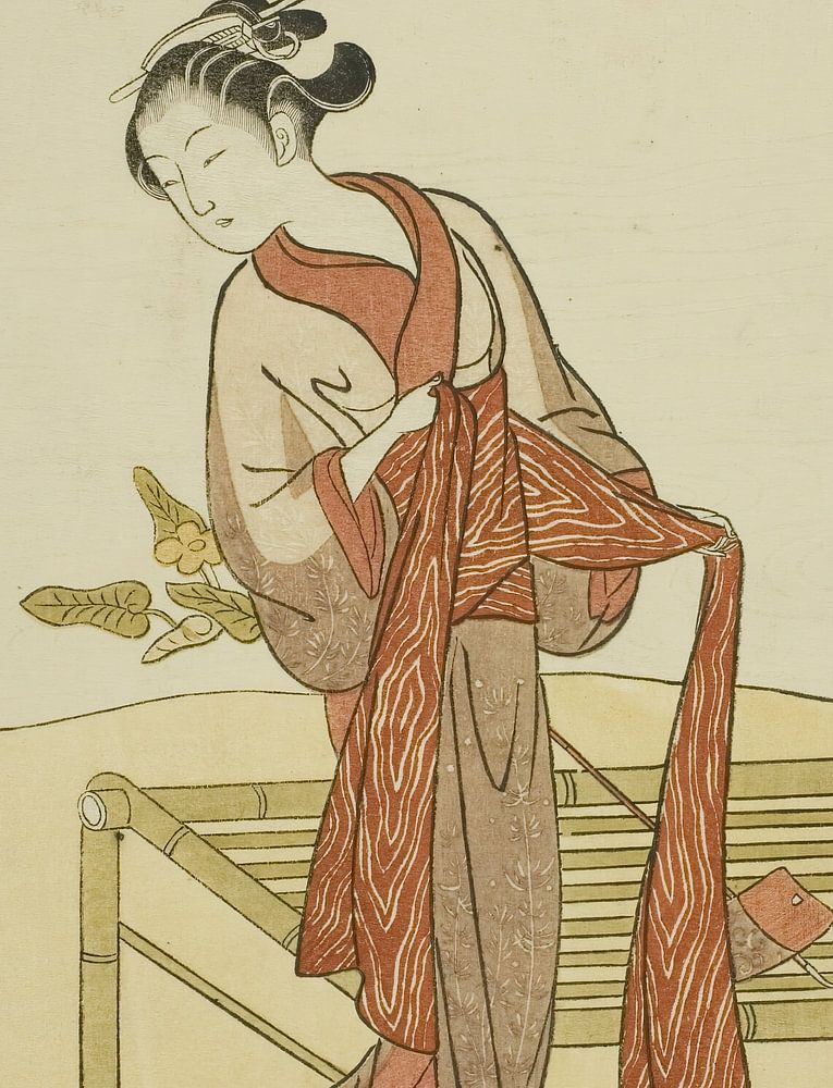 Suzuki Harunobu (1725 - 1770) était un éminent graveur sur bois japonais du XVIIIe siècle, connu pour ses importantes contributions à l'art de l'ukiyo-e. Il est souvent considéré comme l'un des pionniers de la gravure sur bois colorée. Harunobu se distinguait par ses représentations délicates et élégantes de beautés, de scènes de la vie quotidienne et de motifs naturels. Il a joué un rôle important dans le développement du style ukiyo-e et a contribué à perfectionner les techniques d'impression en polychromie. Les œuvres de Harunobu reflètent l'esthétique raffinée et la vie culturelle de la fin de l'ère Edo au Japon et sont aujourd'hui des œuvres d'art très appréciées qui mettent en valeur sa sensibilité artistique et son habileté.