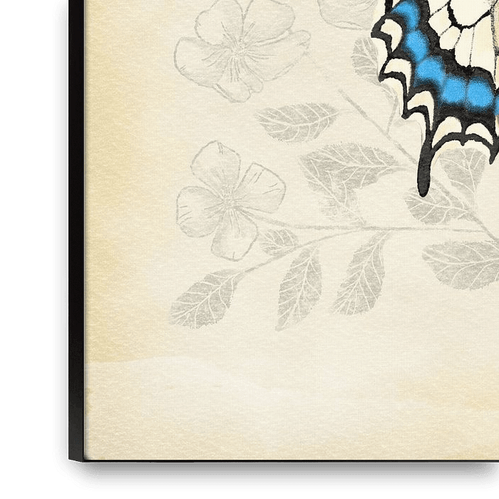 Belle illustration dessinée d'un papillon, le Swallowtail, sur un fond vintage avec un croquis de fleurs et de feuilles.