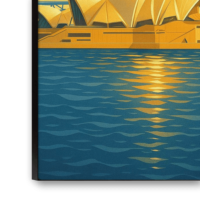 Cette magnifique illustration de Sydney capture l'une des côtes les plus emblématiques du monde, baignée d'une chaude lumière dorée. Conçue dans un style Art déco raffiné, l'œuvre d'art met en valeur le célèbre Opéra de Sydney, dont les gracieuses voiles brillent sous un ciel doux et matinal. Le pont du port de Sydney s'étire élégamment à l'arrière-plan, tandis que des oiseaux de mer planent au-dessus des eaux paisibles, complétant une composition intemporelle, exaltante et pleine de charme côtier.