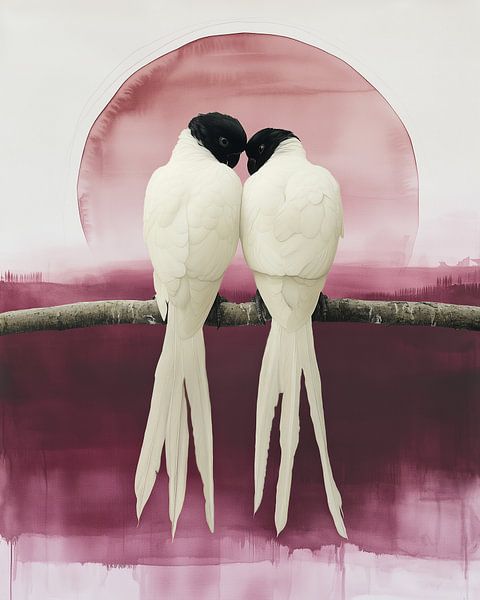 Deux oiseaux élégants se reposent côte à côte sur une fine branche, leurs corps se reflétant presque parfaitement l’un dans l’autre dans une posture calme et intime. Leur plumage blanc se fond doucement l’un dans l’autre, tandis que leurs têtes sombres s’effleurent légèrement — un moment tendre de complicité qui constitue le cœur de…