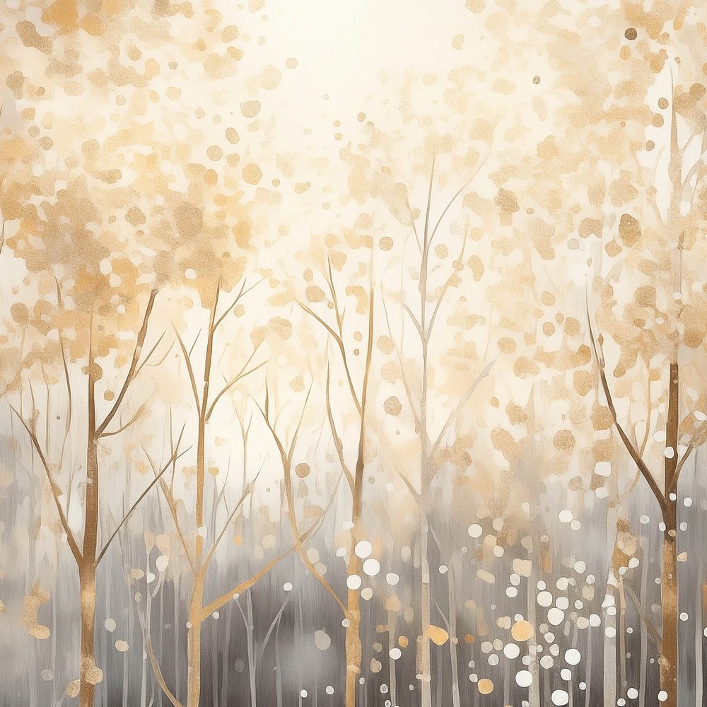 Paysage forestier impressionniste dans les tons d'automne, où les arbres sont enveloppés d'une brume de feuilles dorées. La palette de couleurs se compose de tons chauds de beige, de brun et d'or, évoquant un sentiment de calme et la richesse de l'automne. Les effets d'éclairage en arrière-plan ajoutent une atmosphère de rêve et presque magique à la scène.