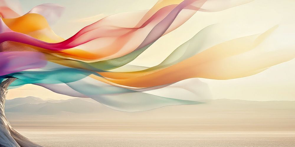 Avec ses rubans vibrants qui enlacent l'horizon, cette œuvre capture l'essence du mouvement et de la liberté. Les lignes fines et ondulées des rubans semblent danser avec le vent, tandis que leurs couleurs vives contrastent avec le vaste désert et la douce lueur du soleil levant. Le paysage dégage une impression de calme infini, à laquelle la dynamique fluide des rubans ajoute une puissante énergie.