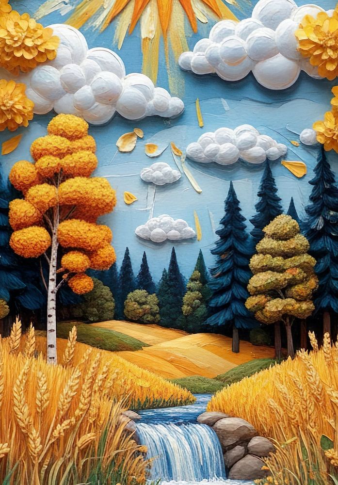 Au cœur de cette scène coule un ruisseau cristallin, qui se jette gracieusement sur les pierres pour former des cascades. Ses eaux fraîches et impétueuses donnent vie aux fleurs éclatantes qui fleurissent le long de ses rives, un contraste délicat de jaune et de blanc avec la verdure luxuriante. Chaque détail respire l'harmonie : le soleil, le ciel, les arbres, l'eau et la terre s'unissent dans un rythme intemporel.
