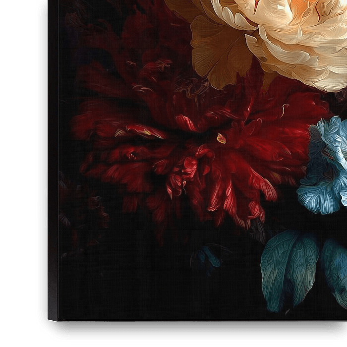Floral Symphony est une ode visuelle à l'abondance, à la couleur et à la sophistication. Dans cette nature morte florale baroque, pivoines, tulipes, roses et chrysanthèmes s'unissent dans une composition luxuriante pleine de vie et de texture. Parmi les fleurs flotte une gracieuse plume de paon aux nuances irisées de bleu et d'orange -…