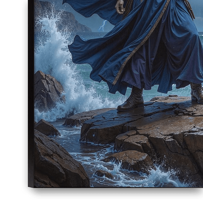 Debout sur des rochers escarpés, le magicien se dresse face aux forces déchaînées de la nature, tandis que des vagues rugissantes frappent la côte et que la foudre illumine le ciel d’une lumière éclatante. Sa cape flottante se fond dans la tempête, son bâton transperce l’obscurité comme une ancre d’énergie pure, tandis qu’au-dessus de…