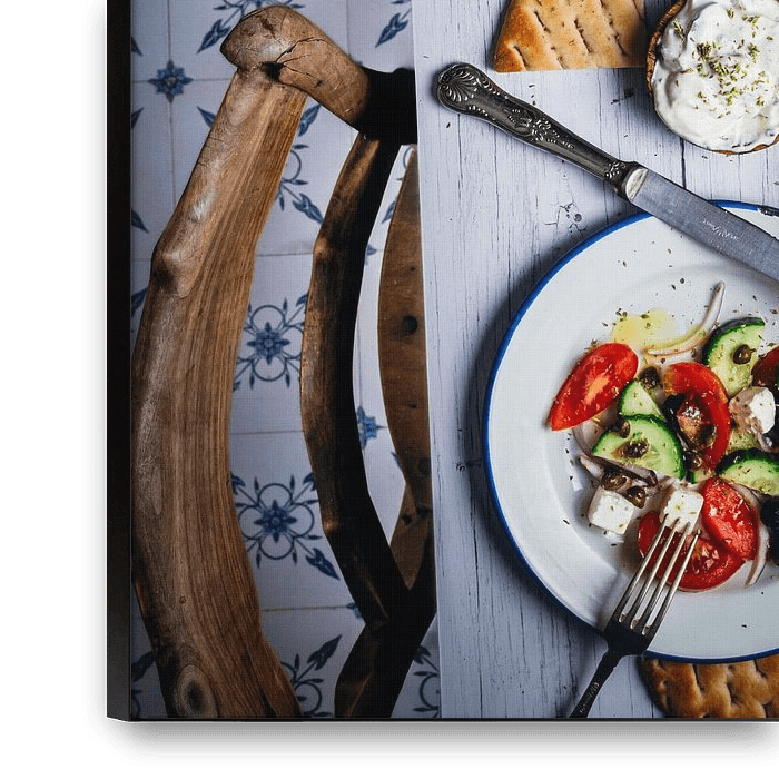 Achetez cette photo Table avec salade grecque par Mediterranean Blue sur toile, aluminium, ArtFrame ou photographie (encadrée), impression d'art en haute qualité et tout format.