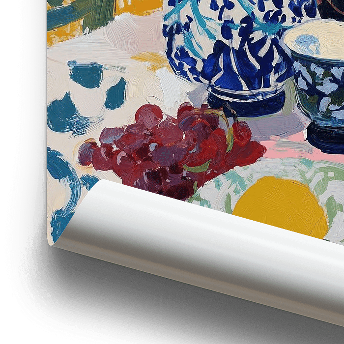 Cette nature morte pleine de vie, débordante de couleurs et de textures, représente une table baignée de soleil, ornée de céramiques à motifs, de fruits mûrs et d'un vase de fleurs épanouies. La composition associe des éléments classiques de nature morte à un coup de pinceau moderne et expressif. Dans le style de Matisse
