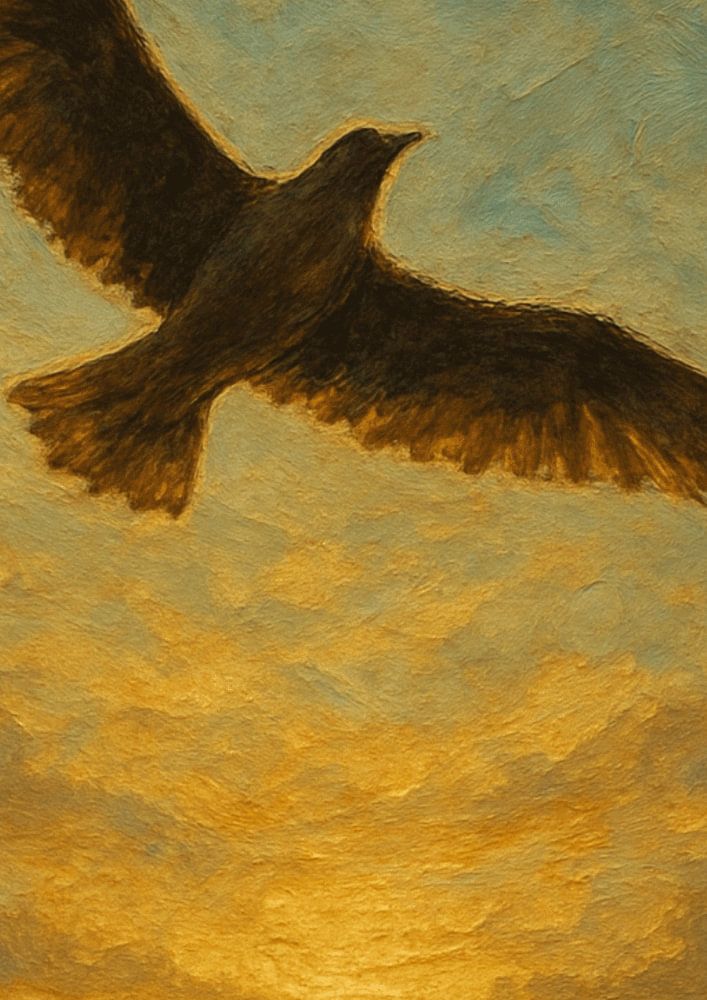 Ce tableau dans le style de la peinture à l’huile capture ce sentiment — un oiseau solitaire s’élevant au-dessus de la lumière chaude du coucher du soleil, ailes déployées, symbole de courage et du pouvoir silencieux de la liberté. Les coups de pinceau visibles et les textures douces évoquent les imperfections de la vie réelle, tandis que la lumière dorée nous rappelle que même les fins (comme un coucher de soleil) peuvent être de beaux commencements.