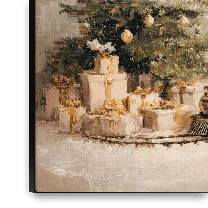 À propos de ‘Tableau de Noël vintage avec arbre, cadeaux et petit train’ par But First Framing