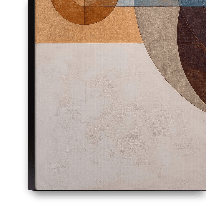 Tableau de hall d'entrée - Remarquez les petites surprises : les fines lignes verticales et horizontales qui divisent la toile en quatre quadrants, les courbes subtiles qui encadrent le grand cercle, et ces petits points rouges, presque ludiques, qui viennent perturber la symétrie avec douceur. Cela rend cette peinture abstraite intéressante de près et sereine de loin — exactement ce qu'une peinture de hall d'entrée ou de salle de réunion doit faire. Cette composition invite à la regarder à plusieurs reprises ; elle montre comment une peinture géométrique peut dégager de la chaleur et de l'humanité sans perdre son aspect professionnel.