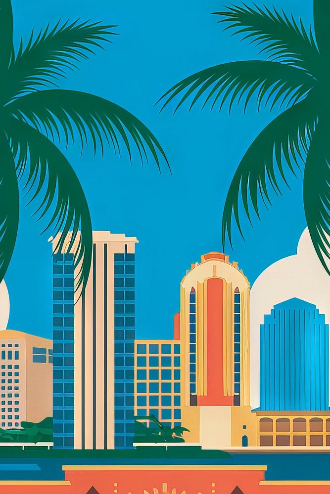 Un jeu vivant de couleurs et de formes s'y déploie : Les feuilles de palmier se balancent doucement dans le vent, tandis que l'architecture de Tampa, avec ses silhouettes marquantes, donne vie à la ligne d'horizon. Cette représentation artistique apporte une touche de Floride dans chaque salon et invite à rêver de journées ensoleillées.