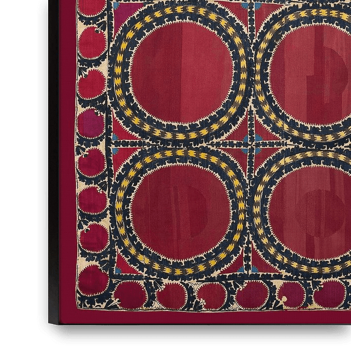 Suzani, 19e siècle Artiste inconnu, Ouzbékistan Soie, coton, lin ; couchure en fil continu, point de chaînette, point de chaînette ouvert. Don de Jack A. et Aviva Robinson. L'original se trouve au Minneapolis Institute of Art. Le suzani est un type de textile tribal brodé et décoratif fabriqué au Tadjikistan, en Ouzbékistan, au Kazakhstan et dans d'autres pays d'Asie centrale. Les tapis suzani sont connus pour leurs dessins vibrants, leurs motifs floraux et leurs couleurs vives. Le mot suzani est dérivé du mot "Suzan" qui signifie aiguille, ce qui signifie que tous les motifs sont brodés à la main sur des textiles tissés à la main. En d'autres termes, le suzani est une grande pièce de textile brodée à la main.