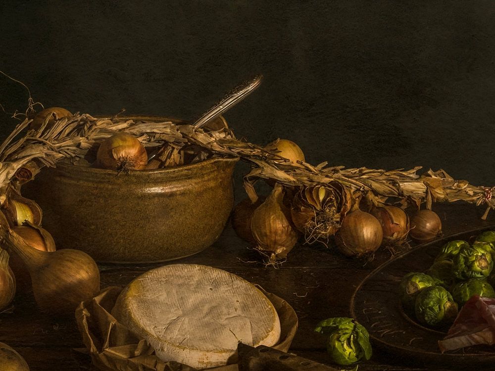 Une nature morte dans le style des anciens maîtres des ingrédients de la tartiflette, un plat français avec du fromage et des pommes de terre : des oignons, des pommes de terre, des germes, des lamelles de lard fumé, un Reblochon, un vieux couteau et une casserole en céramique sur une table en bois.