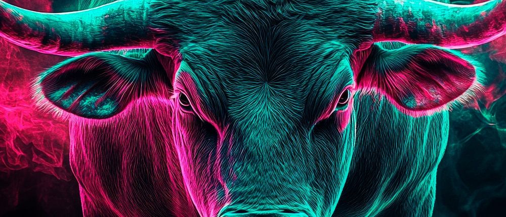 Avec un taureau puissant et lumineux entouré de brumes chatoyantes de turquoise et de rose, cette œuvre d'art apporte une énergie dynamique à n'importe quelle pièce. Les couleurs contrastées et la présence imposante dégagent une impression de force et de confiance en soi et donnent à votre salon ou à votre bureau une touche passionnante…