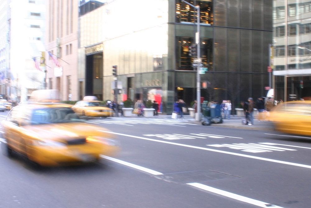 Taxis sur la Cinquième Avenue donnant sur le magasin Gucci de la Trump Tower.
