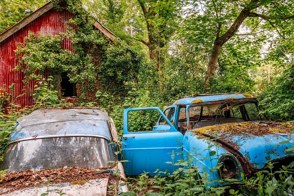 Sur la photo, on voit une petite église de village abandonnée, aux murs de pierre érodés par le temps et à la tour penchée, entourée de collines vertes aux courbes douces - en plein cœur de l'Angleterre. Le bâtiment semble silencieux et oublié par le temps, envahi par le lierre et lentement reconquis par la nature. Devant, deux vieilles voitures anciennes sont garées, couvertes de poussière mais charmantes - comme si elles étaient des reliques d'une époque révolue. La scène dégage un calme mélancolique, presque comme si elle arrêtait l'histoire pour un moment.