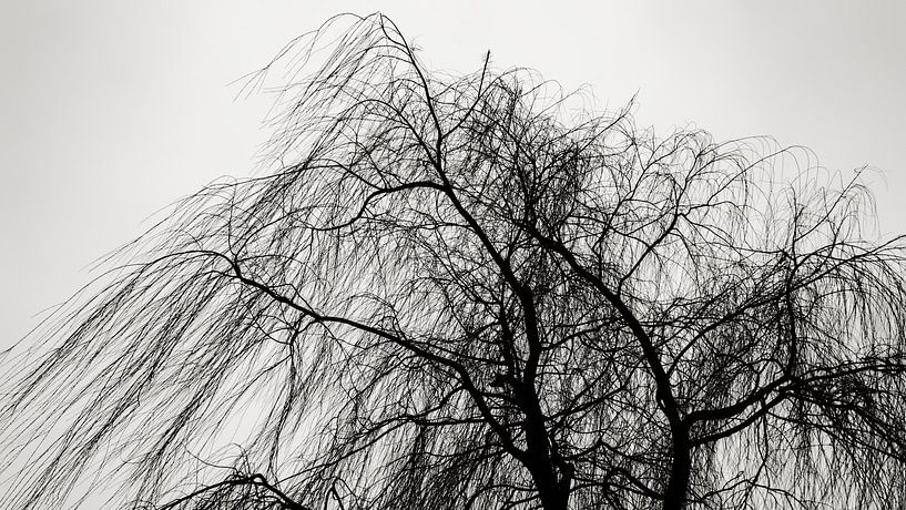 Un saule pleureur pendant la violente tempête de neige du 7 février 2021. Au cours de cette semaine, une vague de froid a atteint les Pays-Bas. Il y a eu un changement de temps avec une grosse tempête avec beaucoup de neige les 7 et 8 février. Cet arbre sur le Cramwinckelplantsoen à Purmerend se tient droit dans le vent. Normalement,…