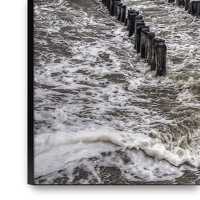 Au panoramaweg à Groede. Une tempête du nord-ouest provoque un beau déferlement de vagues. Il reste principalement des tons gris, ce qui donne une impression de menace.