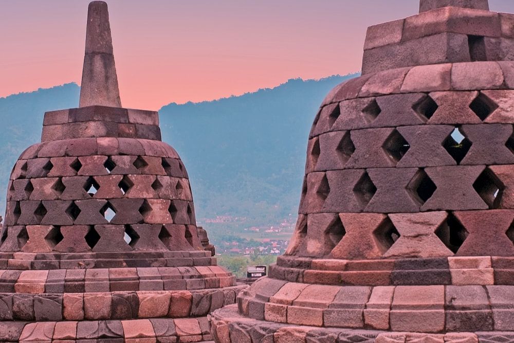 Le temple de Borobudur dans le centre de Java en Indonésie au coucher du soleil. Ce célèbre temple bouddhiste date des 8e et 9e siècles.