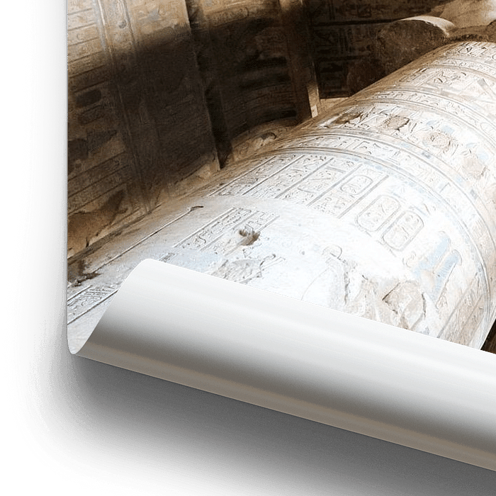 C'est l'Égypte ancienne. Des peintures bleues et des reliefs avec des hiéroglyphes ornent le temple de Dendera. Les colonnes s'élèvent à des mètres dans le ciel. Des sculptures du dieu féminin Hathor complètent les colonnes.