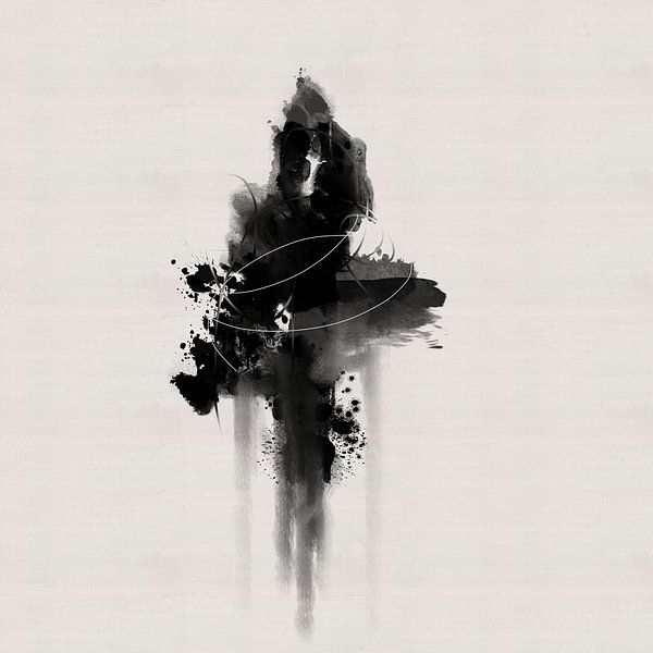 Composition dynamique de traits, d'éclaboussures et de glacis d'encre noire. La forme centrale semble amorphe et ressemble à une figure humaine. Des lignes blanches délicates et sinueuses sont tissées dans les formes sombres. L'atmosphère générale est mystérieuse et évoque un sentiment de contemplation.