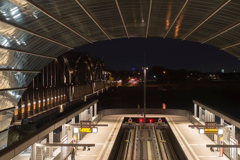 Le bâtiment futuriste de la gare de la nouvelle ligne U4. A l'extérieur, à gauche, on peut voir dans l'obscurité les anciens ponts de l'Elbe.