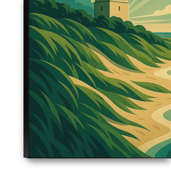 Célébrez la beauté sauvage des îles néerlandaises des Wadden avec cette impression d'art mural Terschelling. Avec le phare historique de Brandaris entouré de dunes et de paysages côtiers, cette œuvre d'art allie l'élégance des affiches de voyage vintage et la sérénité du charme balnéaire hollandais. Des rayons rayonnants s'étendent dans…