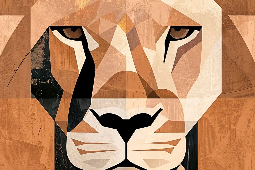 Ce design art déco élégant offre une interprétation moderne et abstraite du lion majestueux. La composition harmonieuse de formes géométriques et de couleurs douces et terreuses reflète un aspect à la fois apaisant et puissant. Cette création joue avec les frontières entre les contours familiers de la nature et l'expression artistique stylisée. La palette de couleurs monochromes est parsemée d'accents d'orange et de beige, dégageant une chaleur qui peut faire de n'importe quel espace un centre d'intérêt. Qu'il s'agisse d'une pièce maîtresse dans un salon minimaliste ou d'un sujet de conversation dans un bureau élégant, cette œuvre d'art est conçue pour capter le regard et ne plus le lâcher.