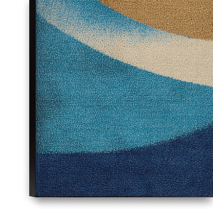 Cette composition abstraite allie des formes fluides à une structure de surface fine, semblable à un tissu. Sur un fond bleu profond, des bandes légèrement incurvées de couleur rose, turquoise et or chatoyant se superposent. Les lignes horizontales créent une profondeur visuelle qui rappelle l'art textile raffiné. La disposition…