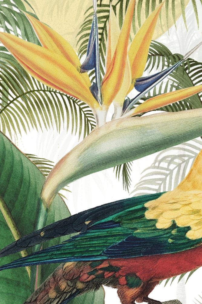 Cette œuvre d'art ensoleillée présente également des palmiers, des fougères, le soleil et un strelitzia.