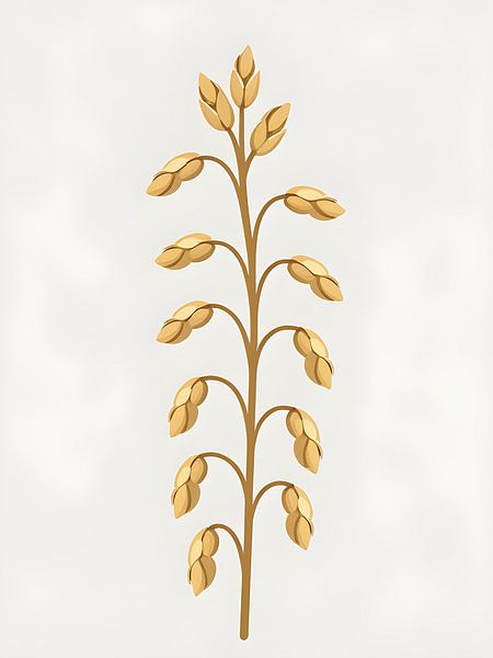 Illustration botanique gracieuse d'une tige d'avoine unique, rendue dans des tons chauds dorés et havane sur un fond blanc épuré. La tige élégante présente des grappes de grains alternés qui se courbent doucement sur des branches délicates, capturant la beauté naturelle de cette céréale essentielle. Parfait pour les thèmes agricoles,…