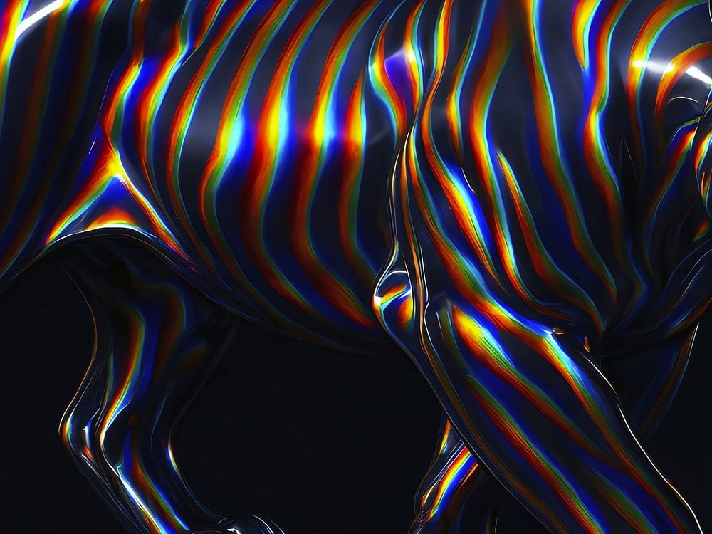 Elle montre un tigre métallique en train de marcher, décoré de bandes de couleur prismatiques qui scintillent sur une surface très brillante et réfléchissante.