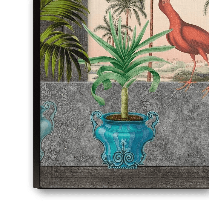 Fenêtre en arc de cercle donnant sur un paysage tropical avec tigres et hérons