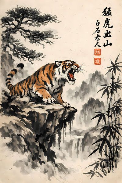 Tigre sur une paroi rocheuse Art traditionnel chinois de l'affiche