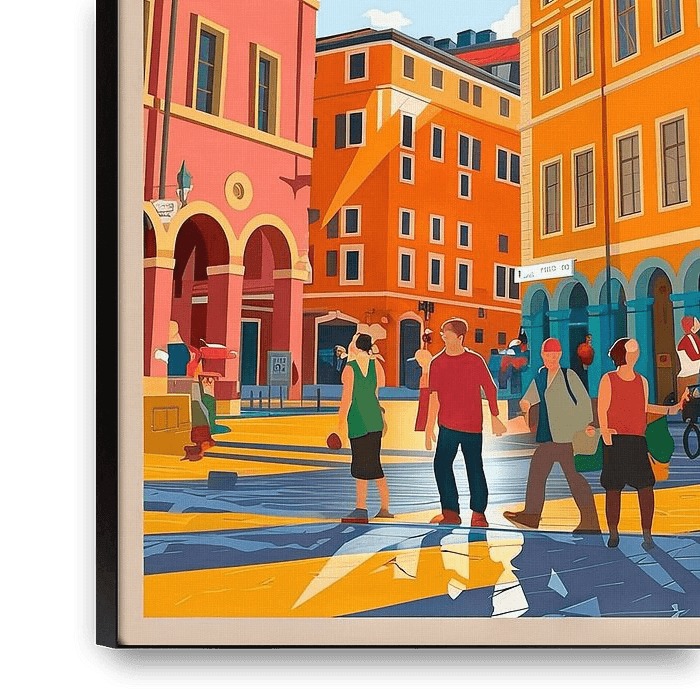 Des bâtiments colorés encadrent une scène de rue animée à Tirana. Les rayons du soleil dansent sur les façades colorées tandis que les gens déambulent joyeusement. Les nuages dans le ciel bleu semblent chuchoter des histoires et invitent à découvrir la culture vibrante de la ville. Un lieu où le passé et le présent se fondent…