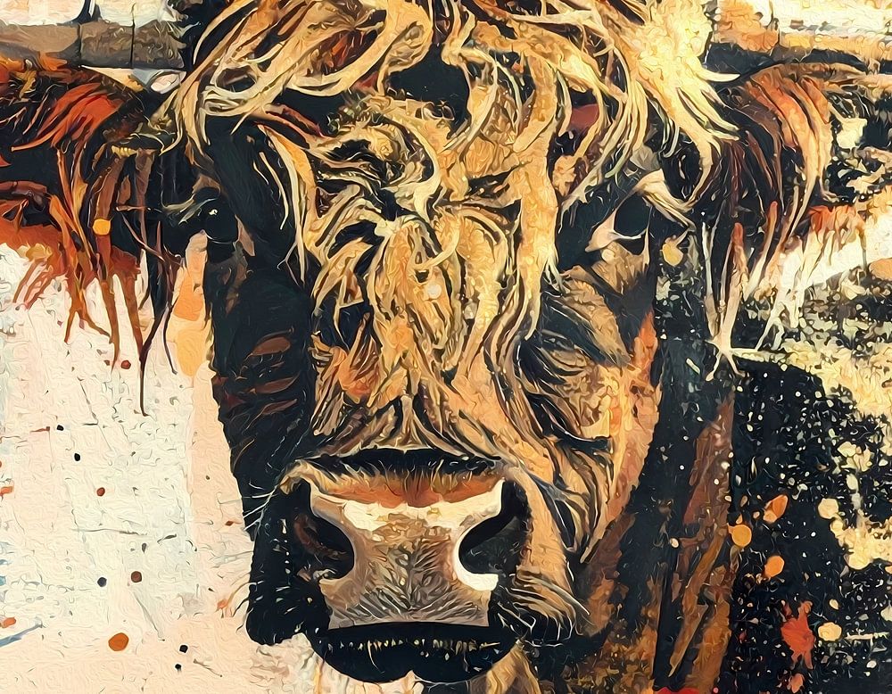 Vache écossaise à cornes, œuvre d'art contrastée dans le style de la peinture à l'huile, tête en lignes principalement noires avec des détails en brun rouille et en feuille d'or, les zones contrastantes de la bordure sont dissimulées en feuille d'or.