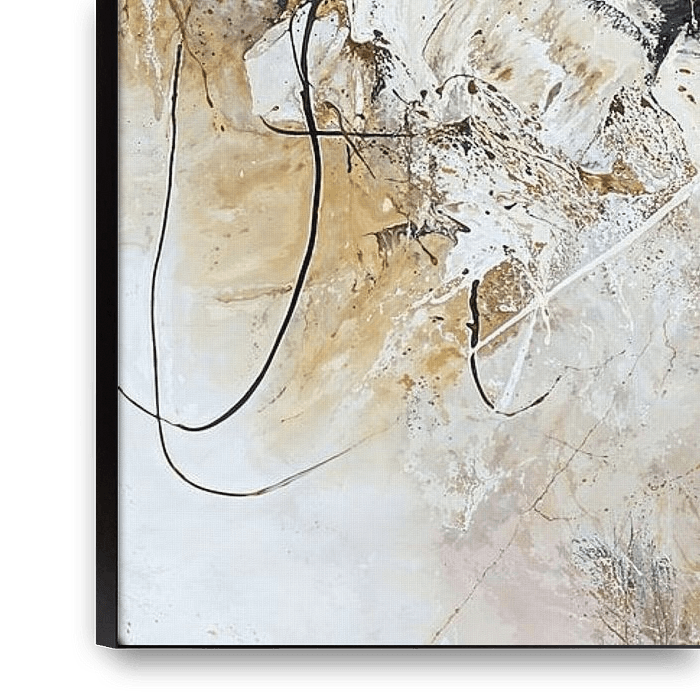 Earth tones - Une œuvre abstraite dynamique qui dégage un chaos harmonieux grâce à un jeu de textures et de couches. Les tons de terre dominants, ponctués de touches d'or, créent une riche palette qui confère chaleur et profondeur à tout espace. L'utilisation du noir ajoute un effet dramatique et guide le regard.