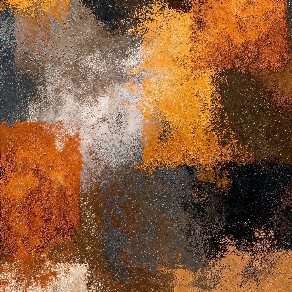 Une peinture abstraite composée de carrés de couleurs dans des tons principalement terreux, avec quelques touches de gris ici et là. Les coups de pinceau sont visibles, ce qui donne à la surface un effet d'empâtement rugueux. Les carrés sont disposés selon une grille légèrement irrégulière et se chevauchent, créant ainsi une impression…