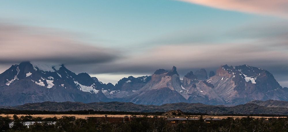 Le parc national Torres del Paine avec son massif montagneux unique. Au-dessus des sommets, des nuages teintés par le coucher du soleil dérivent.