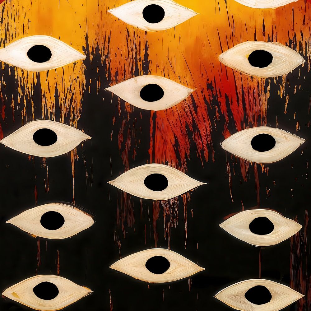 Une icône légèrement troublante qui exige une attention immédiate et soutenue, représentant une multitude d'yeux stylisés et non clignotants émergeant d'une pyramide dorée rayonnante. Cette pièce maîtresse frappante est placée sur un fond rouge sang, rendu avec une qualité viscérale et tactile. La composition austère et symbolique comprend des gouttes de peinture noire, ressemblant à de l'ichor sombre, évoquant à la fois la création et la décomposition. Cette pièce puissante et hypnotique explore les thèmes de la connaissance ésotérique, de la surveillance divine et des rituels interdits, ce qui la rend idéale pour les projets axés sur la mythologie, la psychologie et l'occultisme, ou comme couverture puissante et symbolique.
