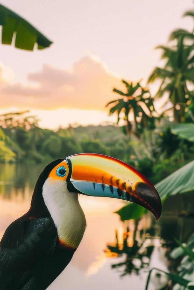 Au milieu d'un paysage tropical luxuriant, un magnifique toucan se présente sur une branche. Son remarquable bec multicolore se détache vivement sur les douces couleurs du coucher de soleil. Ce décor harmonieux de palmiers et d'eau calme confère à l'image une ambiance magique qui célèbre la beauté de la nature.